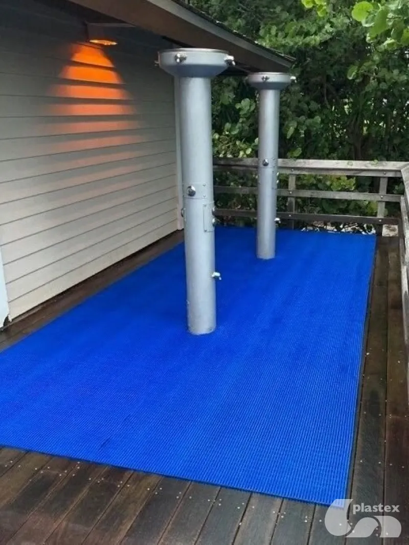 Pools and changing areas need solid underfoot surfaces like tiles or decking, but these surfaces are hazardous when wet, and become uncomfortably hot to walk on when exposed to direct sunlight.