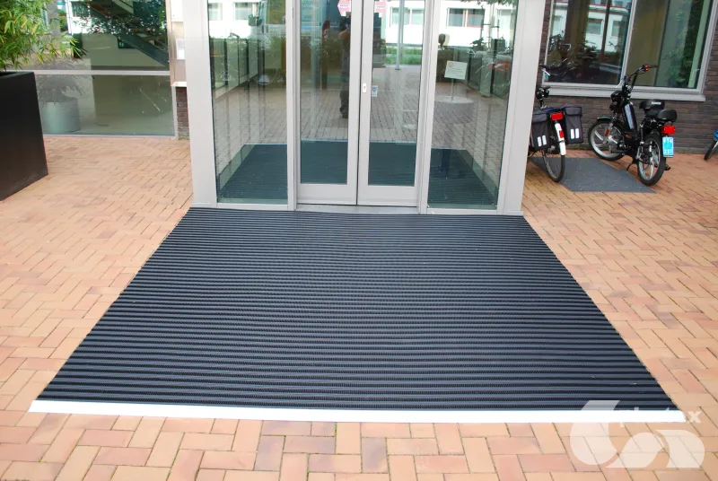 Puede usar un marco en forma de T (27 mm) para dividir la alfombra en secciones de izquierda a derecha. Esto hace que sea más fácil levantarla y limpiarla. Se suministra en secciones de 3 m (10') de longitud con tornillos de fijación y clavijas. Se suministra en aluminio anodizado y con un revestimiento en gris oscuro y blanco.
